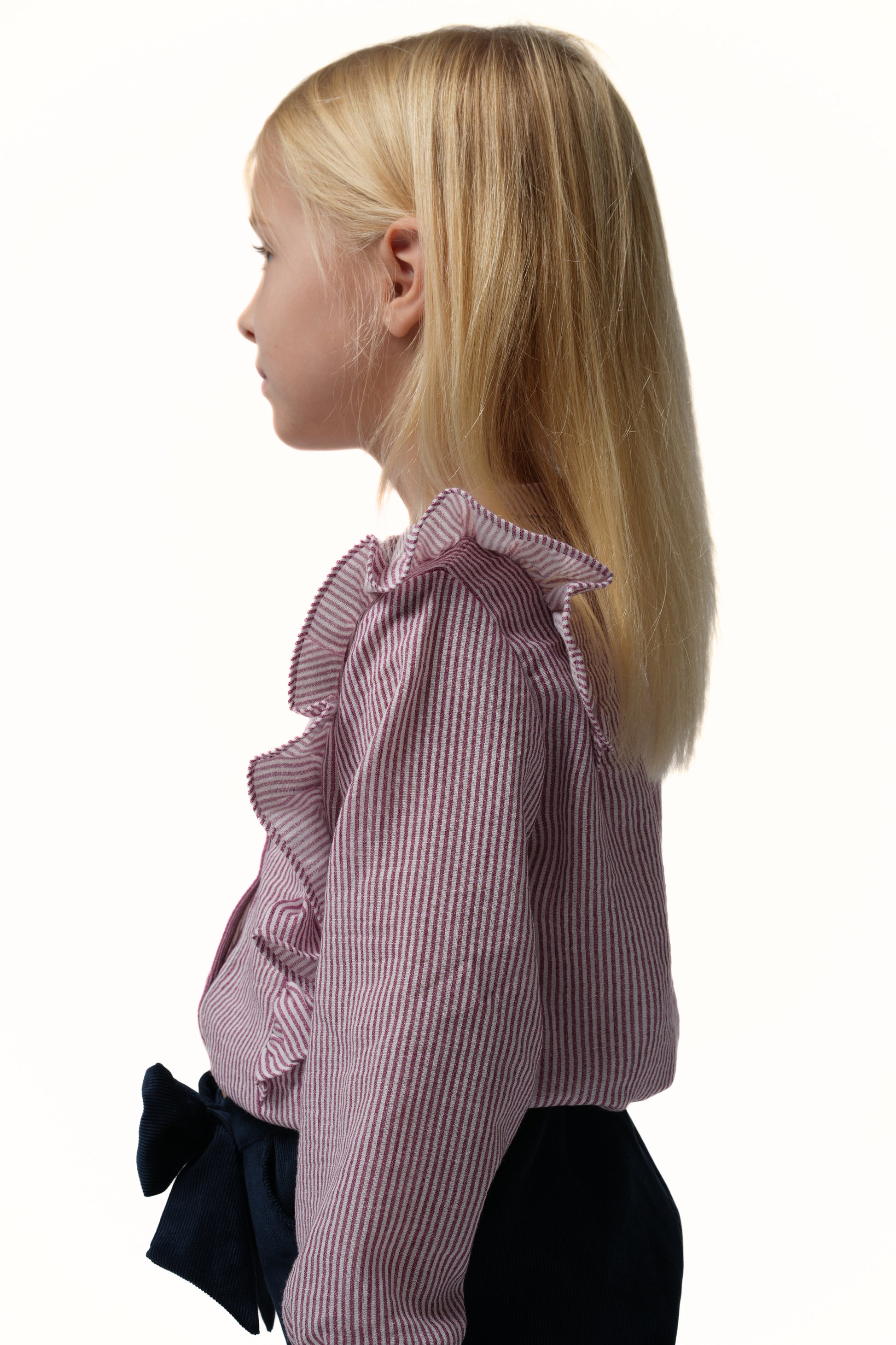 Chemise en lin rayée en couleur bordeaux avec manches longues bouffantes et col mao. Le devant de la pièce comporte un empiècement volanté aux emmanchures. La chemise contient une ouverture boutonnée au devant.
