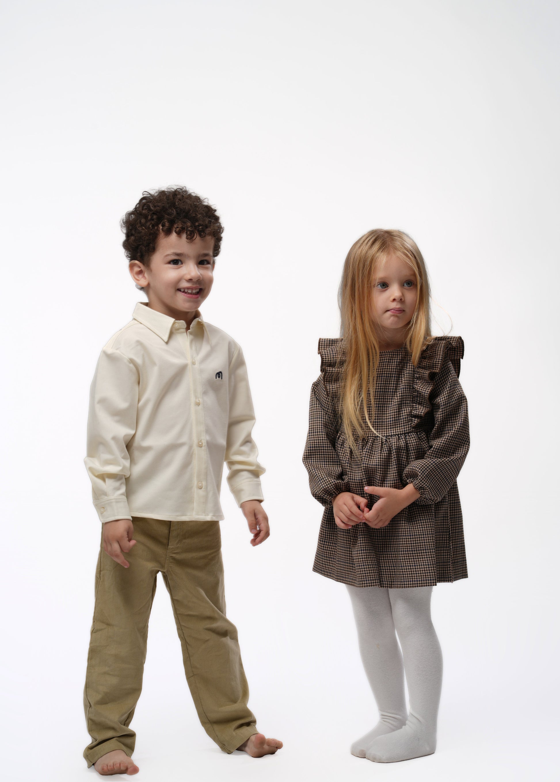 Robe à petits carreaux moka, crème et bleu roi à manches longues bouffantes et poignets élastiques. Un empiècement volanté s'étend au devant la robe et une ouverture boutonnée au dos pour un enfilage facile.